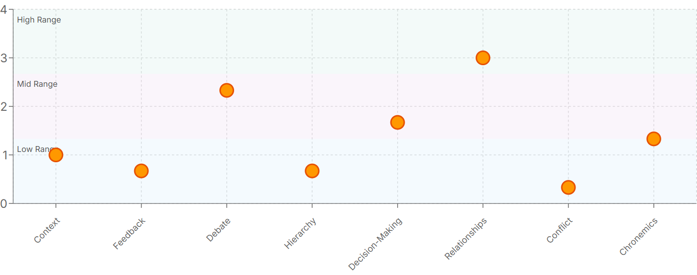 The graph to the right shows the work environments that I tend to prefer. I thrive in environments with structured timelines and clear deadlines, which keep projects on track. I communicate directly and precisely and am comfortable addressing conflicts openly, believing honesty and clarity produce the best outcomes. I value evidence-based discussions, thoughtful decision-making, and constructive feedback, fostering a collaborative space where ideas are explored and solutions reached efficiently.
